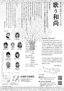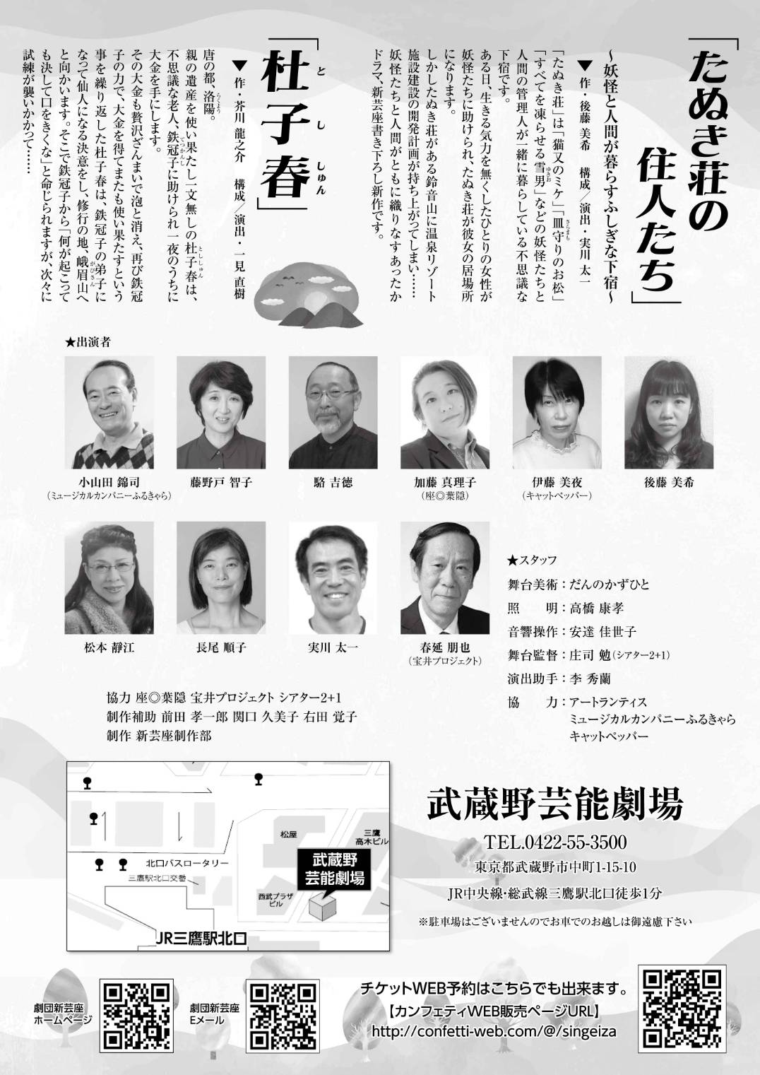 「たぬき荘の住人たち」(作/後藤美希 ・ 構成、演出/実川太一)と「語り芝居 杜子春」(作/芥川龍之介 ・ 構成、演出/一見直樹(アートランティス))の2本立てです。