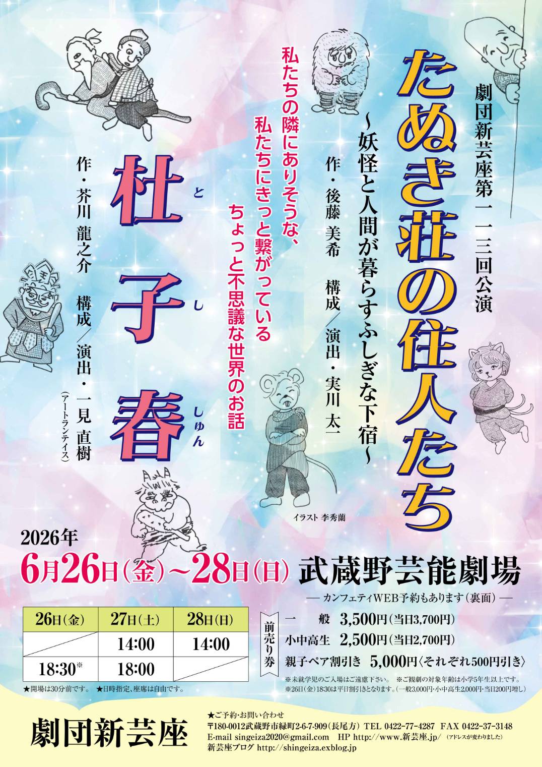 「たぬき荘の住人たち」(作/後藤美希 ・ 構成、演出/実川太一)と「語り芝居 杜子春」(作/芥川龍之介 ・ 構成、演出/一見直樹(アートランティス))の2本立てです。
